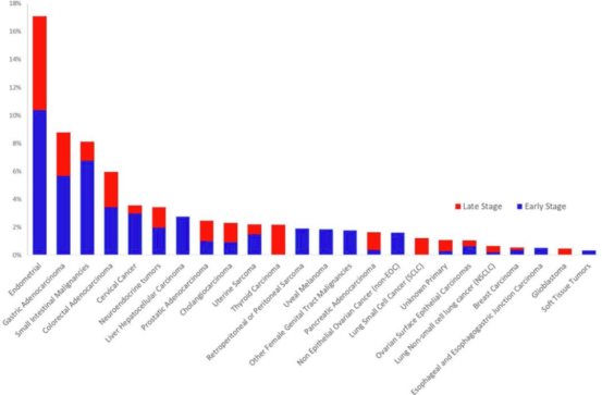 各肿瘤亚型发生dMMR的比例:dMMR肿瘤在32个肿瘤亚型中检测到24个,多在早期(定义为< IV期)发现