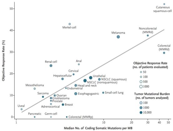 约翰.霍普金斯大学的Elizabeth Marion Jaffee教授通过回顾性分析多个临床研究发现:TMB与肿瘤免疫治疗客观反应率之间存在显著的相关性(P<0.001),相关系数为0.74,表明约55%的不同类型癌症中,客观缓解率的差异可以通过TMB来解释,强调了TMB与多种癌症中PD-1治疗的效果之间存在相关性[3]。