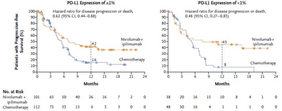 来自于CheckMate227的研究成果更能够真正体现TMB的实力。该研究采用FoundationOne CDx(FDA获批NGS大Panel之一)对TMB进行检测,结果表明:在TMB≥10 mut/Mb的晚期非小细胞肺癌患者中,无论PD-L1表达水平如何,与铂类双联化疗相比,采用nivolumab(“O药”)加低剂量ipilimumab(商品名为Yervoy,CTLA-4抑制剂)的免疫检查点抑制剂治疗的患者明显延长了1年的无进展生存率(42.6%vs13.2% ),无进展生存期也显著延长(7.2月 vs 5.5月)[4]。