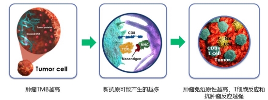 肿瘤突变负荷(Tumor Mutation Burden,TMB)是指一份肿瘤样本中,所评估的编码基因组每兆碱基中发生的体细胞编码检测的置换和插入或缺失突变的总数。免疫治疗是否有效,主要依赖于免疫细胞对癌细胞特异性抗原的识别,而理论上讲,基因突变越多癌细胞产生的新抗原越多,被免疫细胞识别的可能性就越高。因此,TMB越高,患者或许从免疫治疗中获益越多。