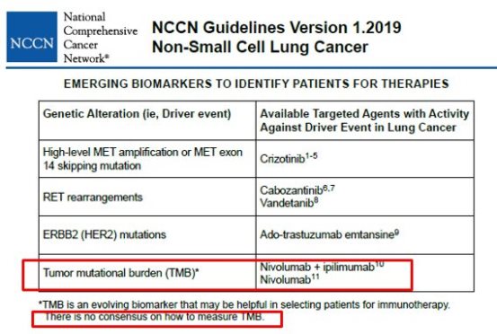 这两个研究奠定了TMB在预测免疫治疗效果中的地位,于是,在2019年第一版非小细胞肺癌(NSCLC) NCCN指南中,新增了推荐肿瘤突变负荷(TMB)用于识别适合接受 “Nivolumab + ipilimumab” 和 “Nivolumab” 的NSCLC患者,但尚无关于如何测量TMB的指南性共识。