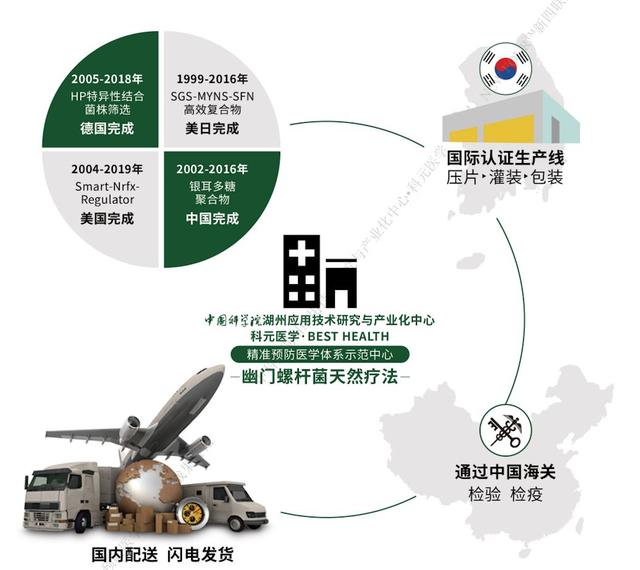 最后按照FDA Medical Food法规,基于多国临床研究数据和确凿的四靶点四机制实验室研究证据,把在德国完成发酵灭活的特定克幽菌株及美国完成的促进肠道功能并改善排便不畅的特定菌株,与在美国日本完成超临界CO2萃取复配的第二联天然高效尿素酶抑制复合体和第三联天然双向智能调节因子,以及在中国完成酶解萃取的第四联天然银耳多糖聚阴离子膜全部集中到韩国,在TGA, NSF, GMP, HACCP,ISO22000五大权威国际认证的生产线上完成了压片或造粒,灌装,包装的产品化过程,之后通过中国海关检验检疫原装进口到中国。