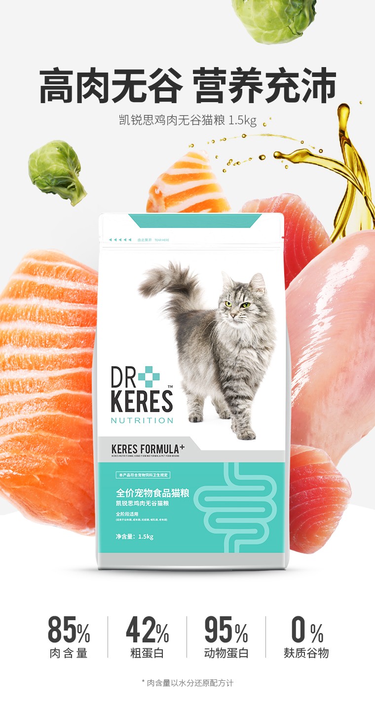 大多数养猫的人都知道猫咪需要高蛋白提供营养,而蛋白质可大致分为两种,一种是动物蛋白一种是植物蛋白,简单来说肉类提供的蛋白质就是动物蛋白,对于猫咪来说,动物蛋白更有利于消化吸收。凯锐思鸡肉无谷猫粮中肉含量高达85%、粗蛋白42%,其中动物蛋白占比为95%。85%肉含量,非常接近猫咪原始饮食,提供的优质动物蛋白,可以减少猫咪肠胃过敏特殊症状。