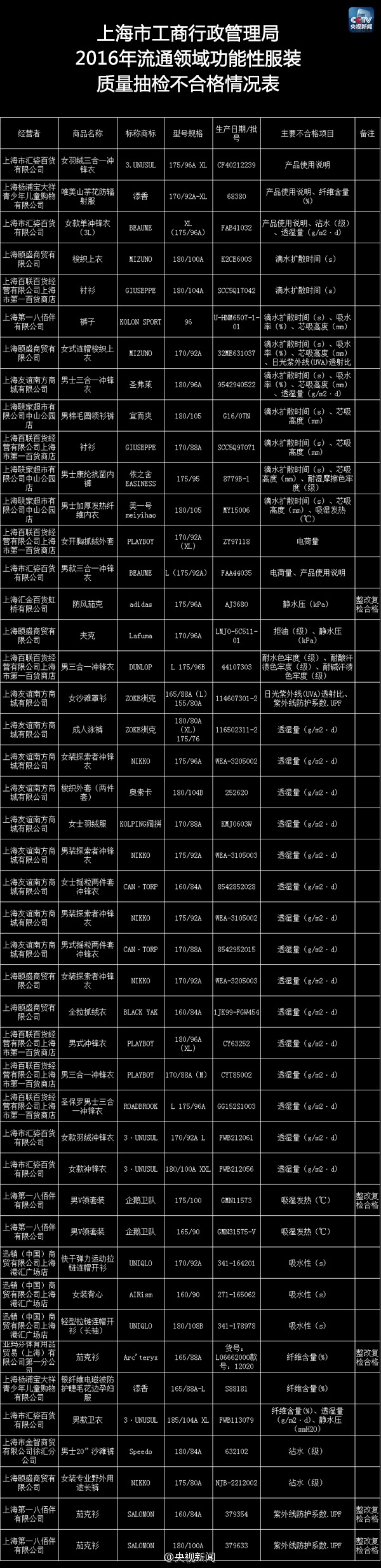 【这些衣服不合格!涉及UNIQLO、Speedo、MIZUNO】近期,上海市工商局对功能性服装进行了质量抽检。经检测,不合格检出率为36%。其中迅销(中国)商贸有限公司上海港汇广场店销售的标称由迅销(中国)商贸有限公司生产(或供货)的“UNIQLO”牌3个批次服装吸水性实测值均低于企业明示标准。(央视记者王殿甲)