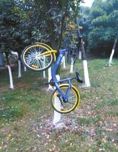 共享单车遇尴尬:被上锁、挂上树藏进绿化带