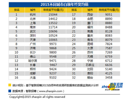 2015年不同城市白领年终奖均值 图片来源:智联招聘