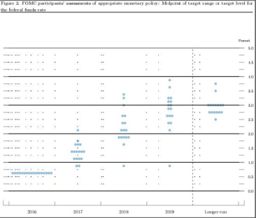 上一期的点阵图于9月公布。多数联邦公开市场委员会成员预计2017年会有两次加息,2018年有3次加息,长期利率中值在3%左右,相较于2015年12月的3.5%长期利率中值,略有下降。
