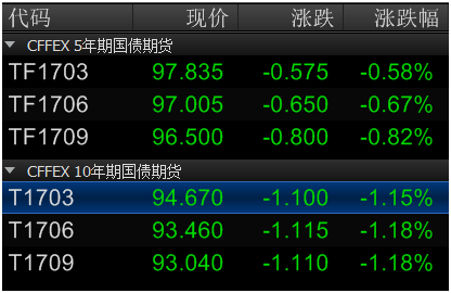 今日开盘10年期国债期货主力合约快速下跌,早盘一度跌逾1%,5年期国债期货早盘一度跌0.9%。截至收盘,10年期国债期货主力合约T1703收盘跌1.15%报94.670元,盘中最大跌幅为1.47%;5年期国债期货主力合约TF1703收盘跌0.58%报97.835元,盘中最大跌幅为0.89%。