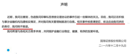 国海证券今日早间发布声明称,近期公司注意到伪造印章私签债券交易协议的事件引起一些媒体的关注。目前,正在积极与事涉金融机构沟通核实情况,并对公司有关管理制度进行自查。公告最后一句话掷地有声:相关事件核查清楚后,依法应承担的责任,公司绝不推诿。(中新经纬APP)