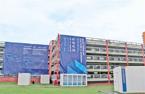 杜塞尔多夫市政府牵头,与北威州政府和议会共同发起为期6天的首届“新丝路上的蓝色集装箱”活动。这也成为第一个由德方政府部门牵头、积极响应“一带一路”倡议的活动。图为北威州议会厅外近2700平方米空地上展示的集装箱。