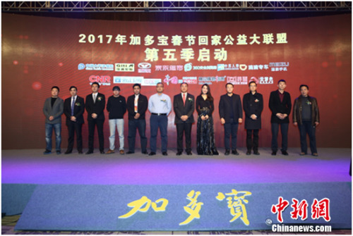 中新网12月22日电 12月21日,由加多宝携手京东超市、360浏览器、凯翼汽车、太平洋保险等10家爱心企业联合发起的“送宝回家让爱团圆”加多宝春节回家公益大联盟第五季在京正式启动。交通部路网中心出行服务处副处长郝盛、中央人民广播电台中国交通广播总编辑杨博、京东商城消费品事业部干货食品采销部水饮冲调部总监朱昊等出席了发布会。届时,多家企业整合自身优势资源,开辟春节回家绿色通道,共同助力在外游子过上团圆年。