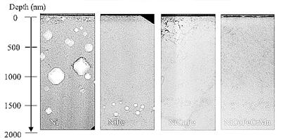 但密歇根大学核工程和放射科学教授王路敏(音译)率领团队另辟蹊径。他们请美国橡树岭国家实验室提供各种金属含量大致相同的镍钴铁和镍钴铁铬镁两种合金,并将其暴露在能造成二级伤害的辐射环境和500℃高温下。“我们首次发现,合金内不同金属会相互干预。”王路敏说,“这类合金能在高温下变软、低温下变硬,是一类完美的耐辐射材料。”通过用透射电子显微镜分析,他们发现,这些合金的抗辐射能力比纯镍金属提高了100倍。