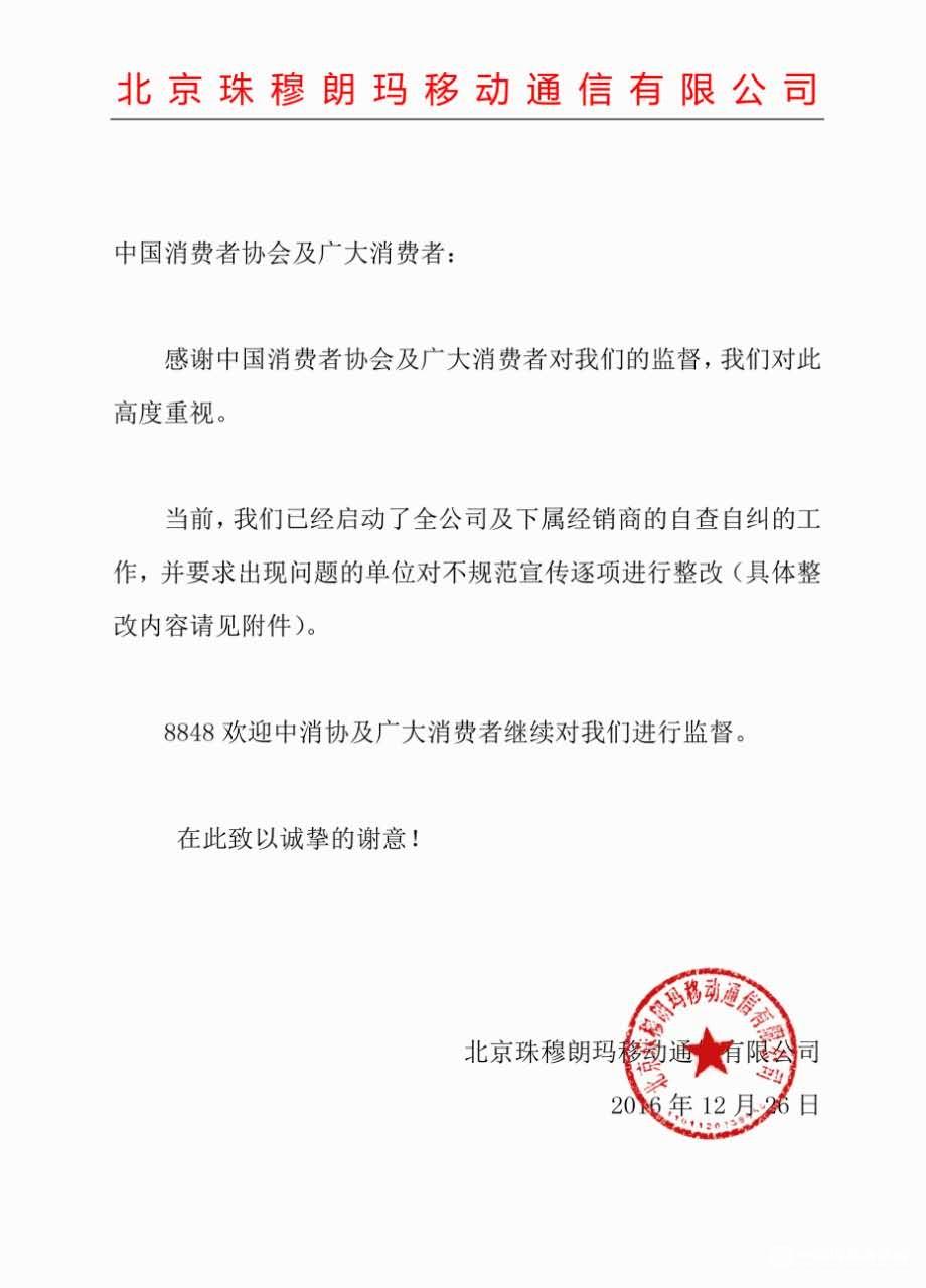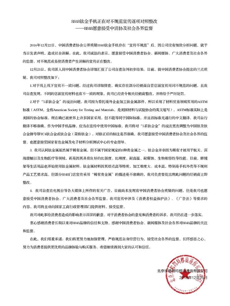 中新网12月26日电 据中国消费者协会网站消息,2016年12月22日,中国消费者协会公开质疑8848钛金手机存在“宣传不规范”后,12月23日,北京珠穆朗玛移动通信有限公司派人到中国消费者协会介绍了公司自查自纠初步结果。