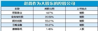 此外,赵薇夫妇还是境内外5家上市公司的大股东,港股上市公司分别为阿里影业(持股4.97%)、金宝宝控股(持股20.59%)、顺龙控股(持股55.01%)、云峰金融(持股55.97%);A股上市公司为唐德影视(1.46%)。 以上述上市公司最新市值计算,阿里影业16.56亿港元,金宝宝控股2亿港元,顺龙控股9.15亿港元,云峰金融73.72亿港元,唐德影视1.62亿元人民币。赵薇、黄有龙夫妇持股市值合计达到92.43亿元人民币。