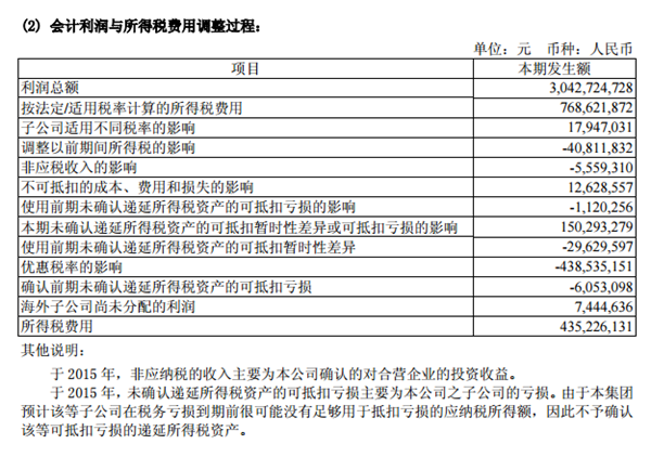 公告披露,福耀玻璃2015年度的利润总额是304272.47万元,如按照美国的40%税率计算,应交企业所得税是121708.98万元,但是福耀玻璃披露的所得税费用是这样的: