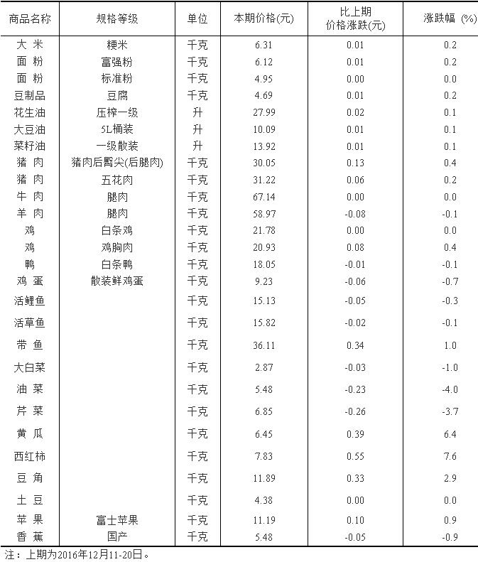 中新网1月5日电 据国家统计局网站消息,统计局今日发布50个城市主要食品平均价格变动情况,数据显示,12月21-30日,猪肉价格微涨,蔬菜价格继续分化,大白菜、油菜、芹菜价格分别下跌1%、4%、3.7%;黄瓜、西红柿、豆角分别上涨6.4%、7.6%、2.9%。