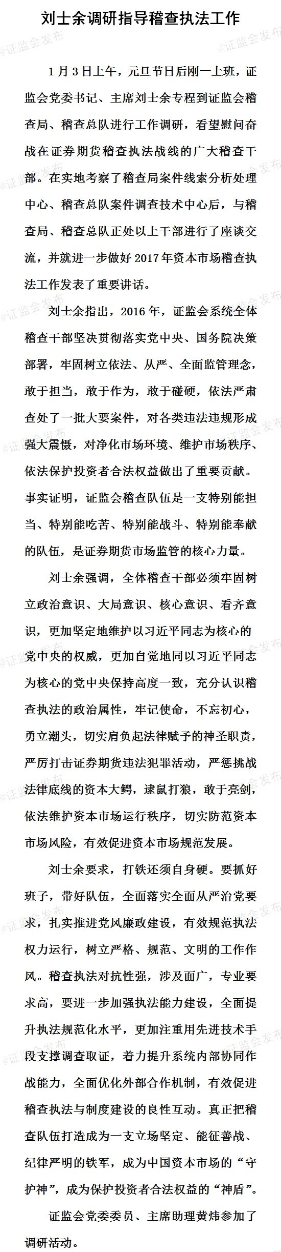 刘士余指出,2016年,证监会系统全体稽查干部依法严肃查处了一批大要案件,对各类违法违规形成强大震慑,对净化市场环境、维护市场秩序、依法保护投资者合法权益做出了重要贡献。