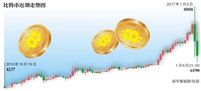 进入2017年,比特币连日狂飙。据交易平台OKCoin行情显示,昨日比特币盘中报价最高报接近9000元人民币,后迅速跳水,一度跌至7100元上下,跌幅近20%,随后震荡回升,截至记者发稿,在6206元人民币上下。