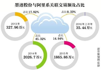 2013年至2016年上半年,墨迹股份向阿里创投的关联方提供劳务产生的关联交易金额合计分别为327.96万元、2026.71万元、1865.86万元和35.44万元,占公司主营业务收入比例分别为17.82%、45.32%、14.94%和 0.33%。2014年,阿里系的应收账款占公司总应收账款的12.86%。