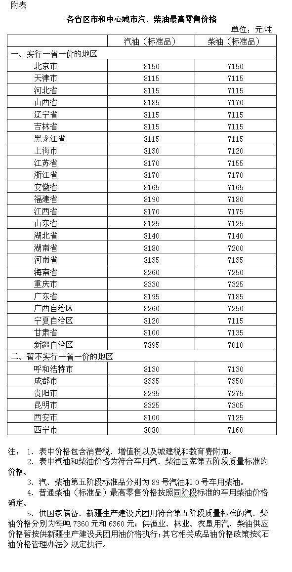 调整后,各省(区、市)和中心城市汽、柴油最高零售价格见附表。相关价格联动及补贴政策按现行规定执行。