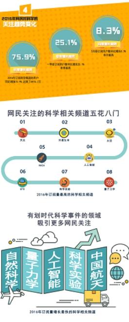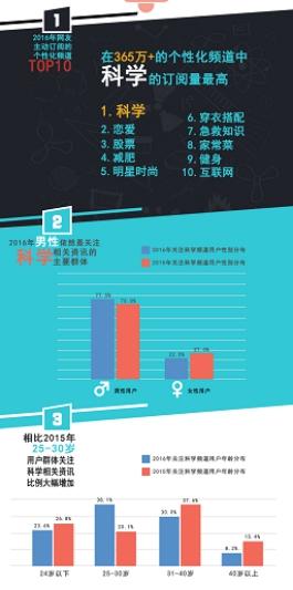 报告数据显示,2016年,网民对科学的关注度明显提升,平台用户年度主动订阅的个性化频道TOP榜中,“科学”订阅量高居榜首。与2015年相比,男性用户依旧是科学相关订阅频道的中流砥柱,整体呈现年轻化趋势;而自然科学、量子力学、人工智能、科学实验、中国航天以其各自领域内的突破性事件,吸引了大量用户的眼球,为更多受众推开了科学世界的大门。