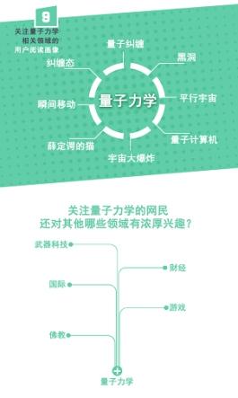 而关注量子力学相关领域的用户主要聚焦“瞬间移动”、“黑洞”、“宇宙大爆炸”、“量子纠缠”等8项内容。此外,他们还对武器科技、财经、国际、游戏、佛教相当感兴趣。
