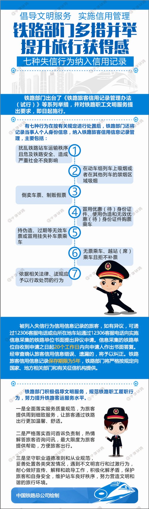 上述负责人指出,在加强铁路旅客信用记录管理的同时,铁路部门积极倡导文明服务,规范铁路职工履职行为,努力提升铁路客运服务水平。一是全面落实服务质量规范,为旅客提供周到细致服务,让旅客通过铁路出行更加温馨、舒适。二是严格落实首问首诉负责制,热情解答旅客咨询问讯,最大限度为旅客提供帮助,方便旅客出行。三是坚守职业道德准则和从业规范,妥善处置各类突发情况,遇到不文明言行和过激行为,耐心做好宣传、解释和疏导工作,积极化解矛盾,保护旅客和自身安全,维护站车良好秩序,努力营造文明和谐的旅行环境。