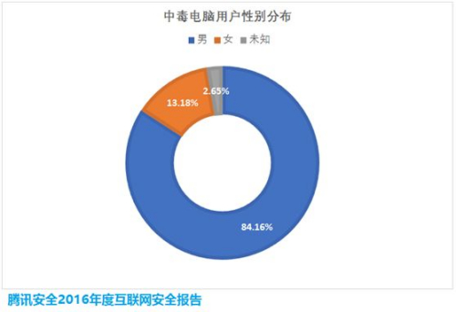 2016年,腾讯电脑管家全年共发现8.2亿次机器中病毒或木马,其中,中毒电脑用户的年龄主要为11到30岁的青少年群体,特别是11至20岁的少年电脑用户占比高达55.58%,且主要以中学生和大学生为主;此外,中毒电脑男性用户占到了8成以上。