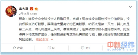 此前李大霄在接受中新经纬客户端(微信公众号号:jwview)采访时便称,相比A股,他更看好港股。李大霄认为港股在2017年会得到资金的大规模配置,而其判断依据是2016年末开放了险资配置港股的权限,2017年将进入实施阶段。