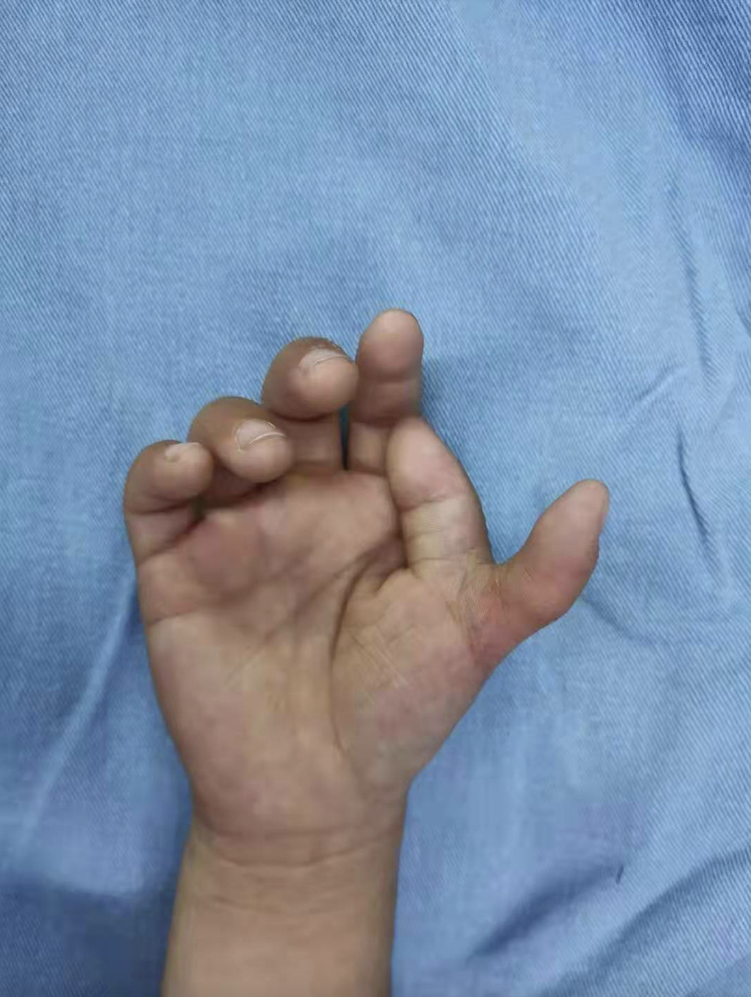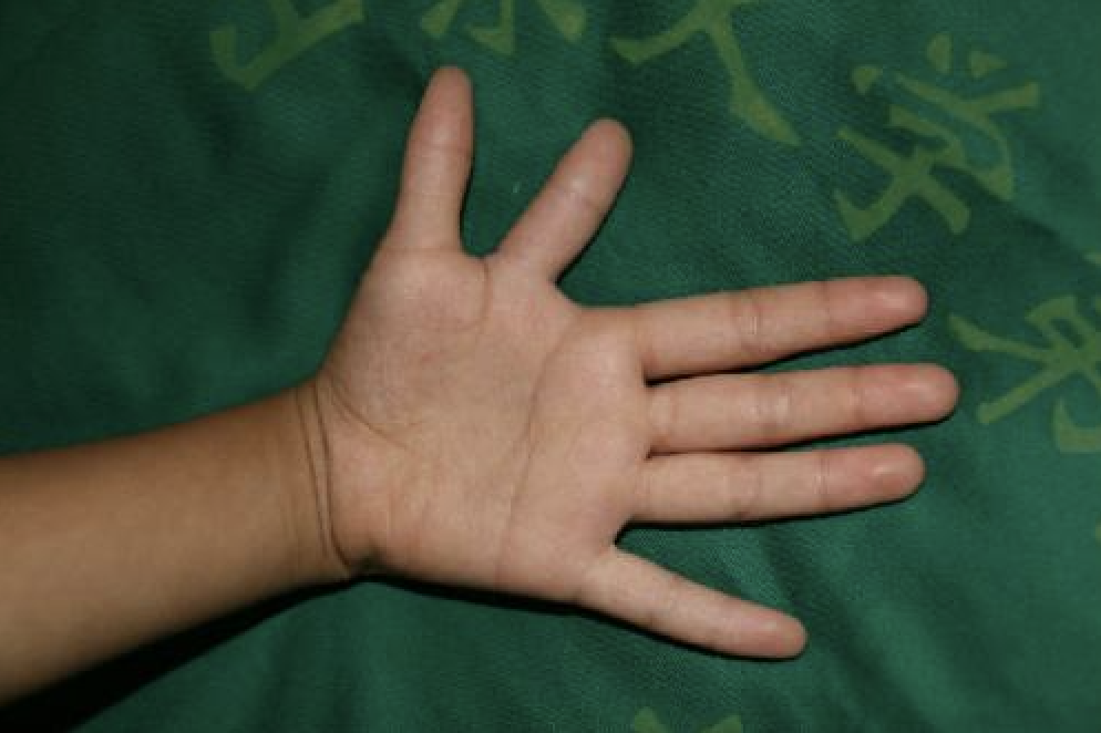 2.简单多指:多指中含有指骨、肌腱和血管神经与正常手指相连,是一个功能缺陷的手指。