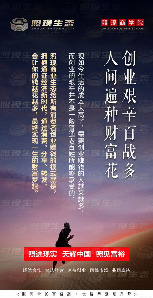 在照现生态平台,你可以推荐商品商家,赚取销售利润,同时推荐人能拿推荐奖励。你还可以消费购物,成为消费商,赚取年底的分红。你更可以成为合伙人股东,赚取股东分润……照现生态的赚钱方式很多,只要你肯努力去做,收入绝对不会让你失望!