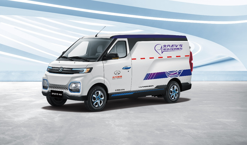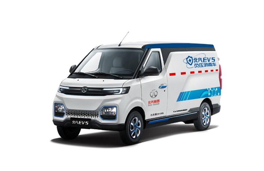 如北汽EV5紫外线消毒物流车,通过加装车载医用级紫外线消毒灯,可向外辐射波长为253.7nm的紫外线,以杀菌能力最强的紫外线波段,30分钟内消杀4.5 m³密闭空间多种病菌,确保无化学物质残留,保证车内空气质量,提供一个安全、无污染的运输空间。