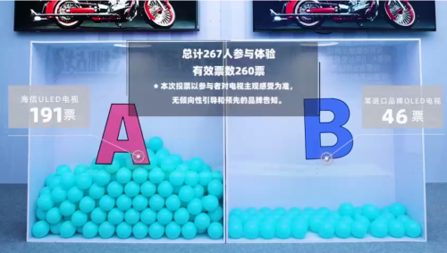 投票结果显示,参与测试的A电视是海信ULEDX新品U8H,B电视是外资品牌的OLED旗舰。在本场高端电视国货VS进口品牌电视画质大比拼中,海信ULEDX电视U8H获得了超八成测试者的投票,以压倒性优势在这场ULEDX 和OLED的碰撞中获胜。