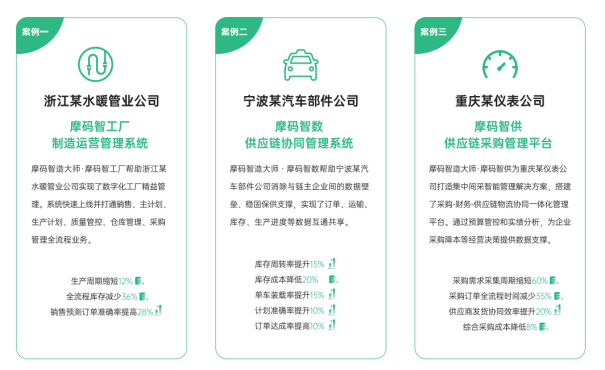 在汽车链主企业极氪汽车制造有限公司,MOMaster打通汽车产业上下游数据链,通过摩码智工厂制造运营管理系统、摩码智供采购供应链协同管理系统、摩码智量供应链质量管理系统等软件,极大地提高整个产业链的柔性能力和应对市场的快速反应能力。