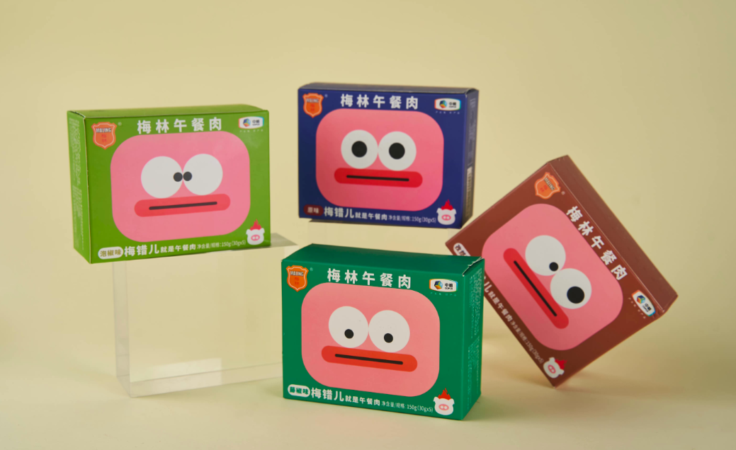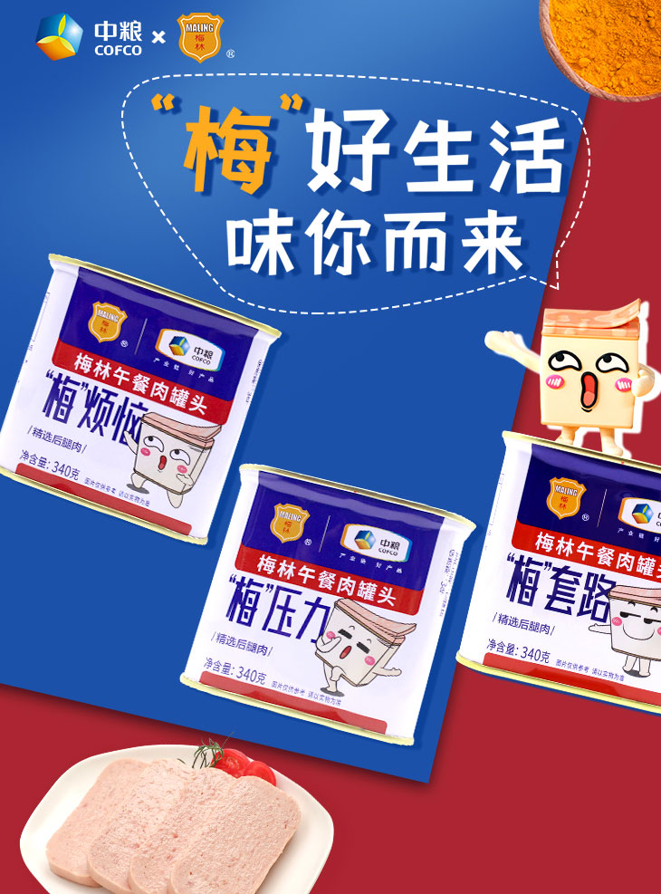 众所周知,中粮梅林早在上世纪五十年代就已享誉中外,也是大众眼中高品质午餐肉的代表品牌。2020年,中粮梅林重磅推出“梅”系列午餐肉产品,区别于以往的传统风格,中粮梅林“梅”系列选择以软萌的卡通形象C位出道,搭配“梅”烦恼、“梅”压力、“梅”套路等时下流行的社交梗,从概念到包装都让人眼前一亮。