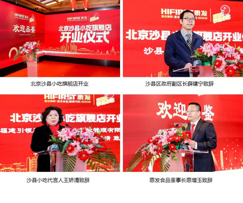 福建省三明市沙县区委书记吴健成,纳通医疗集团副总裁林英钊,国家应急管理部综合协调司司长杨维新,福建省三明市沙县区委常委、统战部长王仁伟,福建省三明市沙县区政府副区长薛建宁,张家口市政府办公室二级巡视员、张家口侨联主席吴一凡,张家口驻京办主任李嘉,诸城市政府正县级干部李耀武,鼎盛信和(北京)投资管理有限公司董事长杨旭,深圳宏时资本管理有限公司总经理曹元涛,中国热带农业科学院驻北京联络处主任王萍,福建引领风骚沙县小吃餐饮管理有限公司董事长、沙县小吃代言人王娇清,山东惠发食品股份有限公司党委书记、董事长惠增玉等领导出席开业仪式。