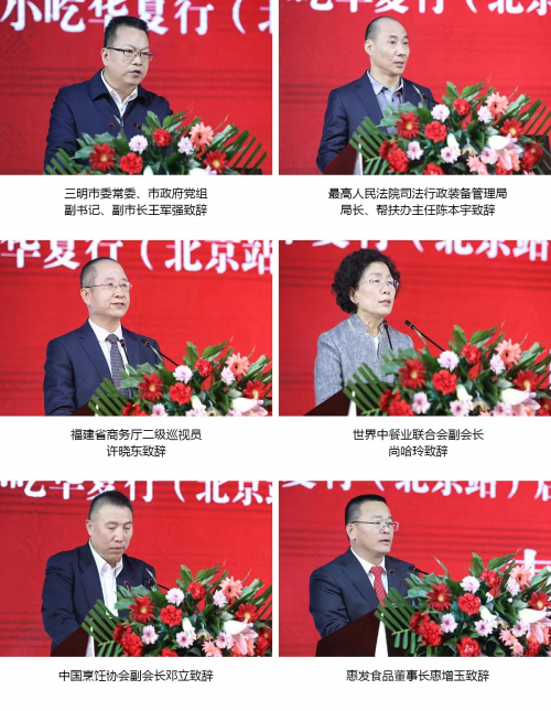 下午,沙县小吃华夏行(北京站)启动仪式暨推介活动在华滨国际大酒店举行,通过与旗舰店联动,同步开展招商引资和文旅专场推介。三明市委常委、市政府党组副书记、副市长王军强,最高人民法院司法行政装备管理局局长、帮扶办主任陈本宇,省政府驻北京办事处党组书记、主任施宇辉,中央纪委国家监委驻农业农村部纪检监察组副组长姜平,中粮集团乡村振兴工作领导小组办公室常务副主任高立新,福建省商务厅二级巡视员许晓东,中国烹饪协会副会长邓立,世界中餐业联合会副会长尚哈玲,福建省三明市沙县区委书记吴健成,山东惠发食品股份有限公司党委书记、董事长惠增玉等领导出席活动。