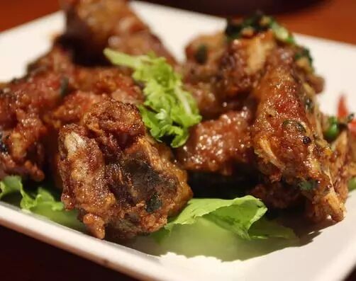 3.锅内热油,油稍多一些,放入排骨炸到表面金黄~~最好再复炸一次,这样排骨会更酥。