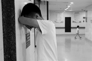 【被罚500蹲起尿血 第二天喊腿疼第三天尿血】昨晚,在中国医科大学附属盛京医院的走廊,由于双腿肿痛,小陶用手拄着墙壁缓解疼痛。 本组照片由辽沈晚报、聊沈客户端记者 白琳 摄