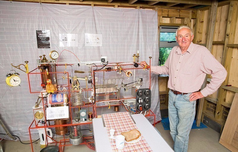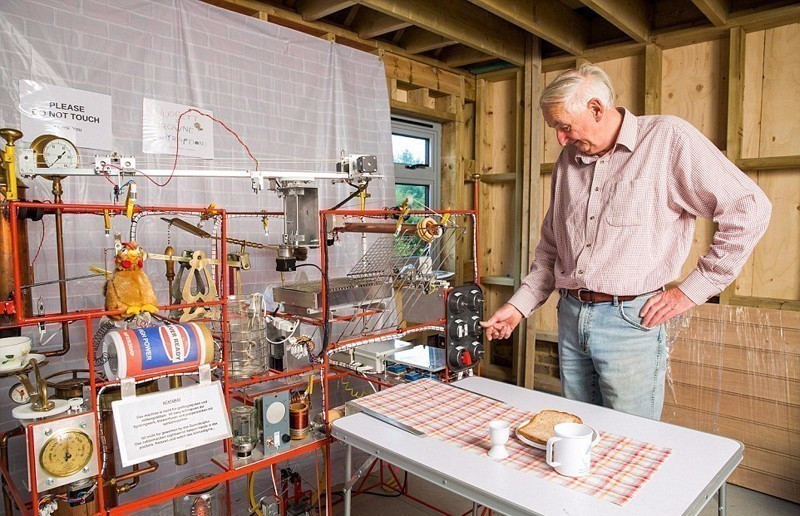【自动早餐神器 69岁的老人耗时约1000小时制作】英国苏塞克斯郡一名69岁的老人日前同朋友耗时约1000小时,制作了一台全自动早餐神器,令人叹服。