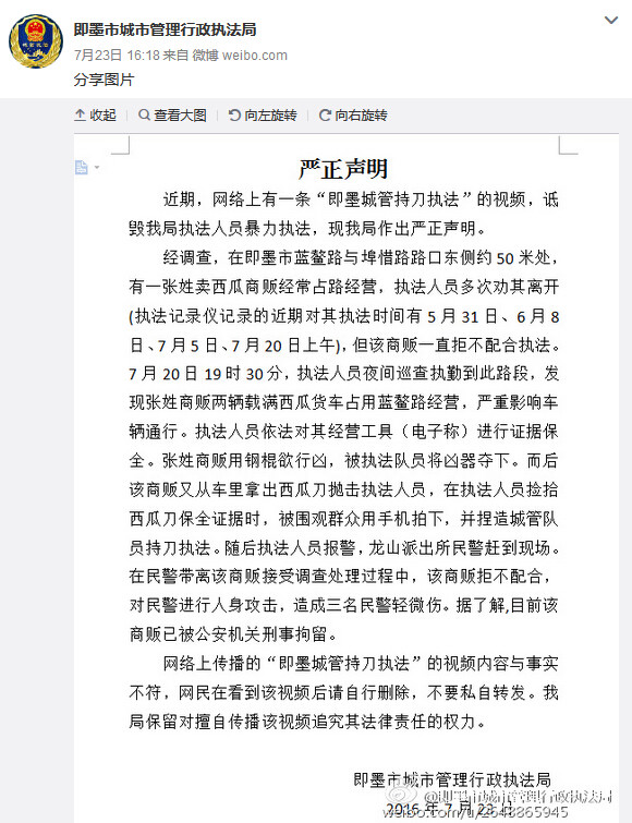 23日,即墨市城市管理行政执法局在官方网站发表“严正声明”的通报称,上述网传“即墨城管持刀执法”的视频系诋毁该局执法人员暴力执法,并称网传视频内容与事实不符,网民在看到该视频后请自行删除,不要私自转发,并保留法律手段措施。