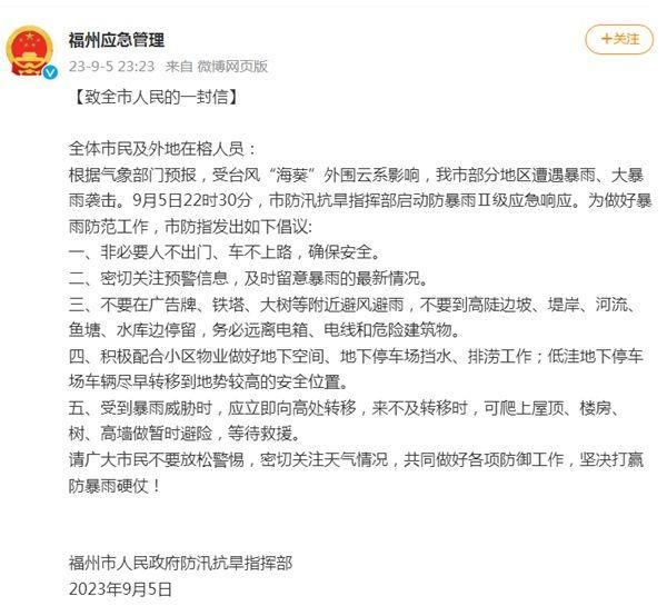 虽然台风海葵”已经登陆,但其影响并未结束。昨天(5日)夜间,福州持续遭受暴雨袭击,暴雨红色预警持续生效。福州市防汛抗旱指挥部紧急启动防暴雨Ⅱ级应急响应,深夜还发布紧急通知,倡议市民除非有必要不出门,不开车。