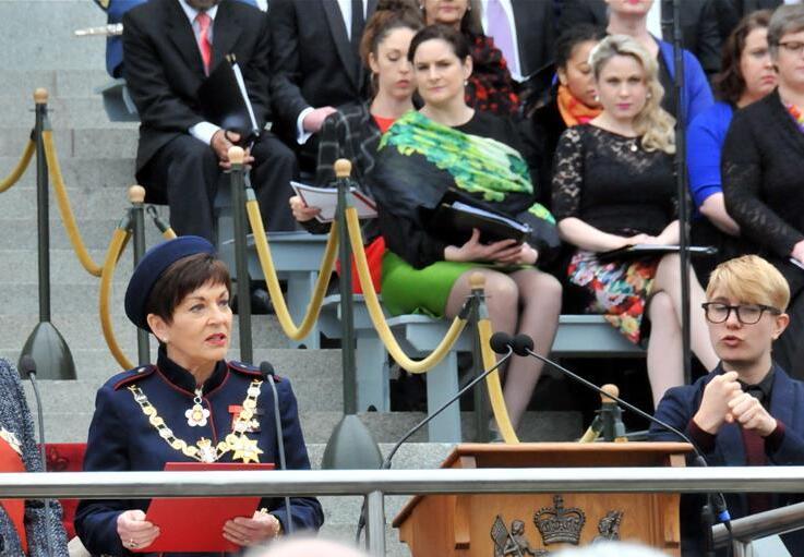 9月28日,在新西兰首都惠灵顿,第21任新西兰总督帕齐·雷迪(前左二)宣读就职誓词。新西兰新总督就职仪式28日在首都惠灵顿议会建筑前的广场举行,帕齐·雷迪在仪式上正式宣誓就任第21任新西兰总督,接替已经届满离任的杰里·迈特帕里,成为第三位出任新西兰总督的女性。 新华社记者宿亮摄