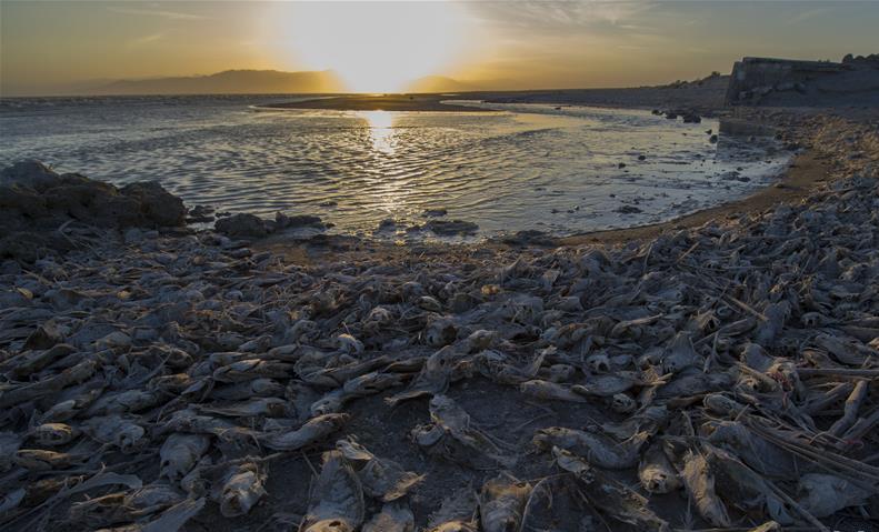 这是2016年4月29日拍摄的美国加利福尼亚州索尔顿湖边堆积的死鱼。