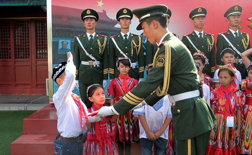2014年09月24日,北京,国旗护卫队员向维族少年赠送国旗。