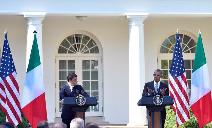 10月18日,在美国首都华盛顿,美国总统奥巴马(右)在与意大利总理伦齐共同举行的新闻发布会上讲话。当日,正在美国进行访问的意大利总理伦齐与美国总统奥巴马在白宫举行联合新闻发布会。发布会上,奥巴马就2016年美国总统选举、美意合作等问题回答了记者的提问。新华社记者鲍丹丹摄