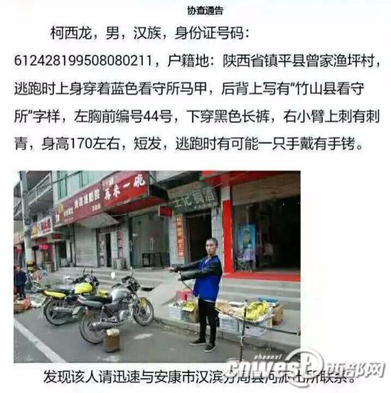从警方发布的协查通告上可看到:嫌疑人:柯西龙,男,汉族,身份证号码:61 2428 1995 0808 0211,户籍地:陕西省镇坪县曾家渔坪村,逃跑时上身穿着蓝色看守所马甲,后背上写有“竹山县看守所”字样,左胸前编号44号,下穿黑色长裤,右小臂上刺有刺青,身高170左右,短发,逃跑时有可能一只手铐有手铐。如发现该人请迅速与安康汉滨分局县河派出所联系。