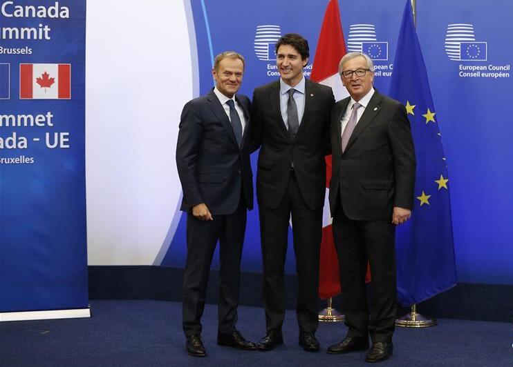 10月30日,在比利时布鲁塞尔,欧洲理事会主席图斯克(左)、加拿大总理特鲁多(中)和欧盟委员会主席容克在会晤前合影。当日,欧盟与加拿大在布鲁塞尔召开峰会,签署《综合经济与贸易协定》。 新华社记者叶平凡摄