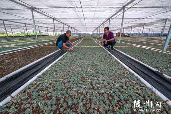 8月3日,随州广水市贫困村长岭镇泉水村村民正在察看多肉植物的生长情况。泉水村引进传崎电子商务有限公司落户,建立了100亩的种植基地,成立了传崎园艺专业合作社,优先安排贫困户在合作社务工,并免费组织贫困户进行培训,帮助贫困户创业致富。 (特约记者 李明清 通讯员 陈影熊摄)
