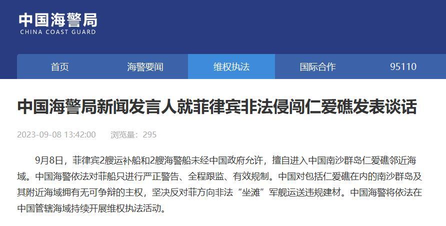 中国海警局发言人就菲律宾非法侵闯仁爱礁发表谈话